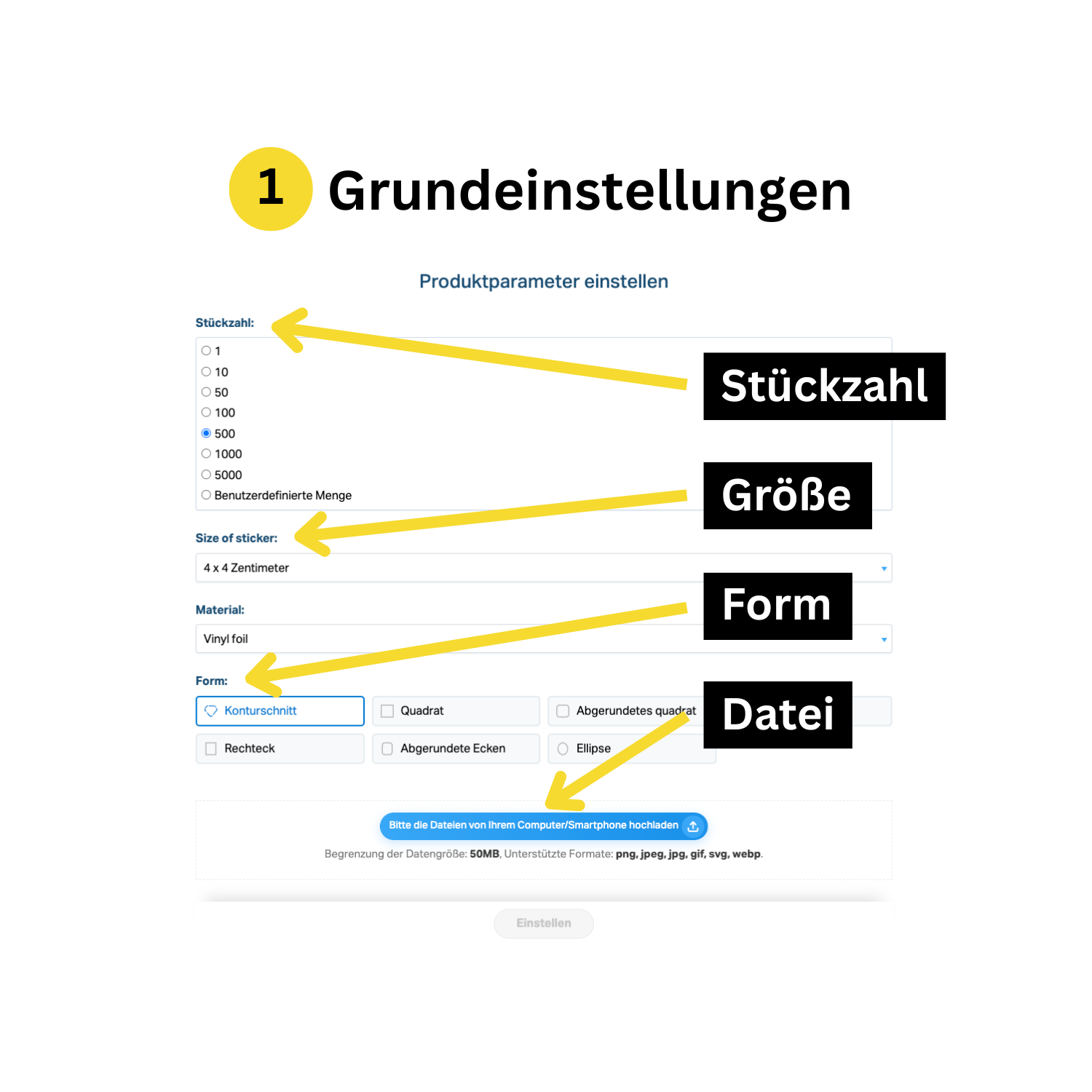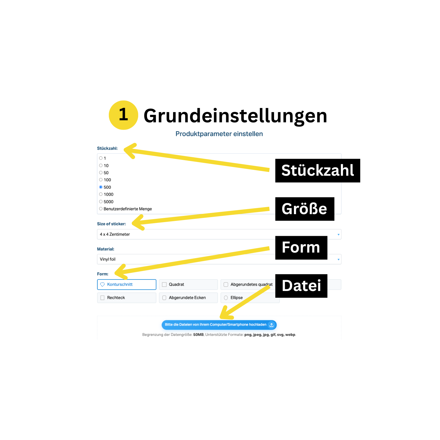 Wähle Stückzahl, Größe, Form und Datei deiner Sticker!