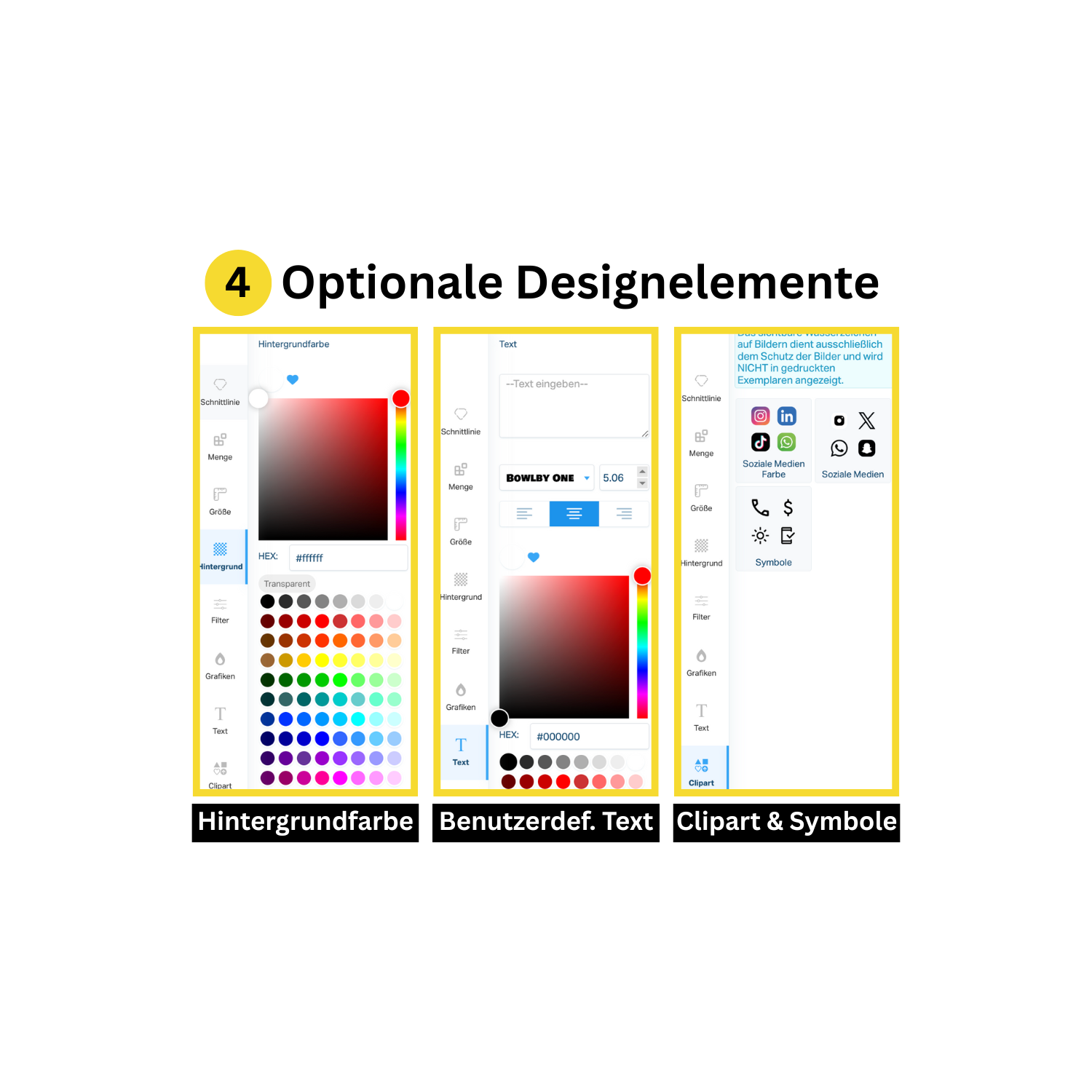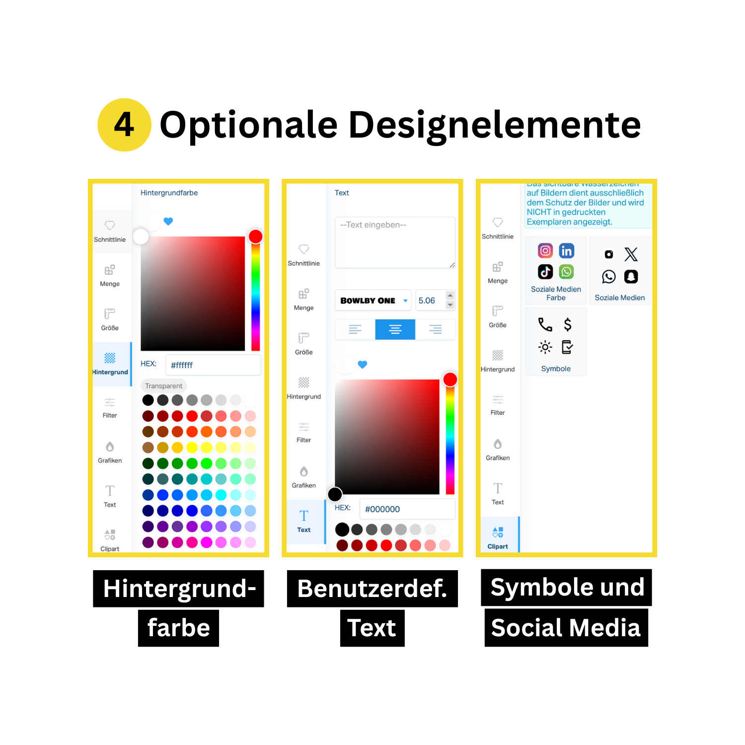 Füge optionale Designelemente wie Text, Icons, uvm. zu deinem Design hinzu.